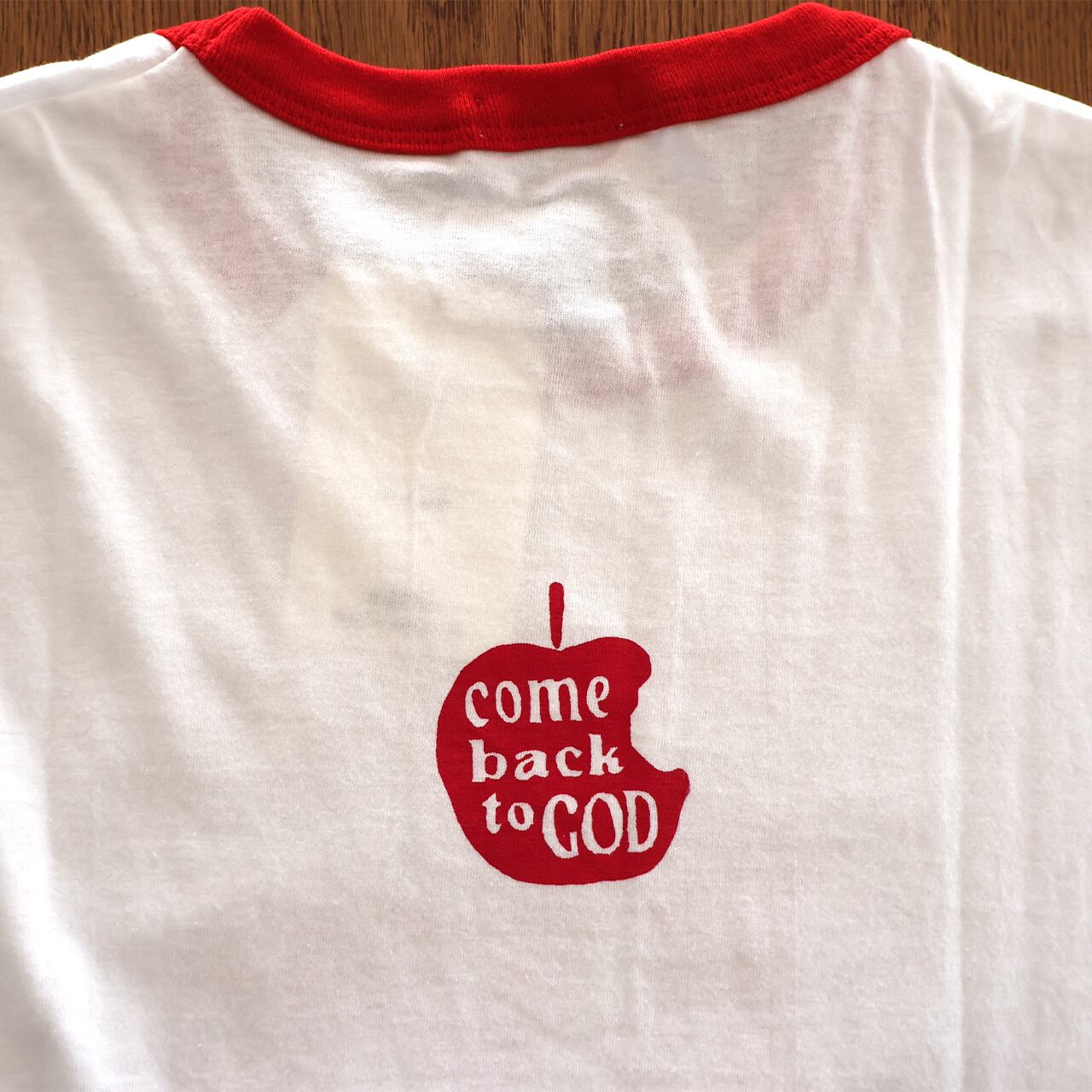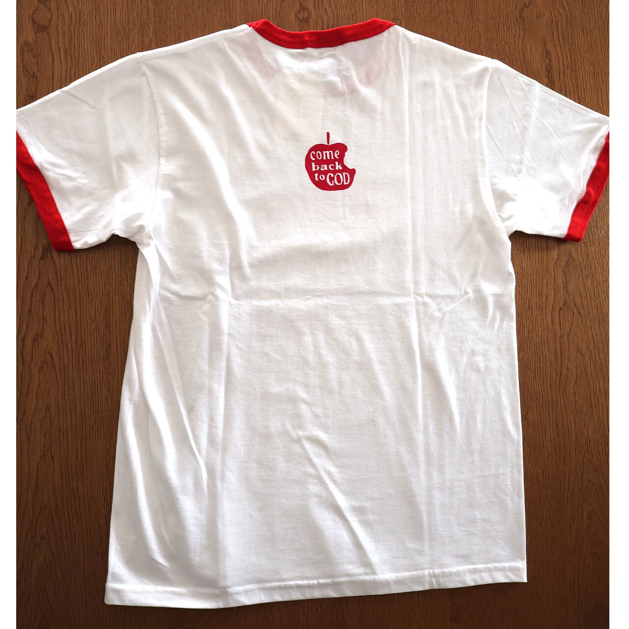 バックにはリンゴの中に「Come back to God(神に立ち返れ)」の文字がプリントされています。