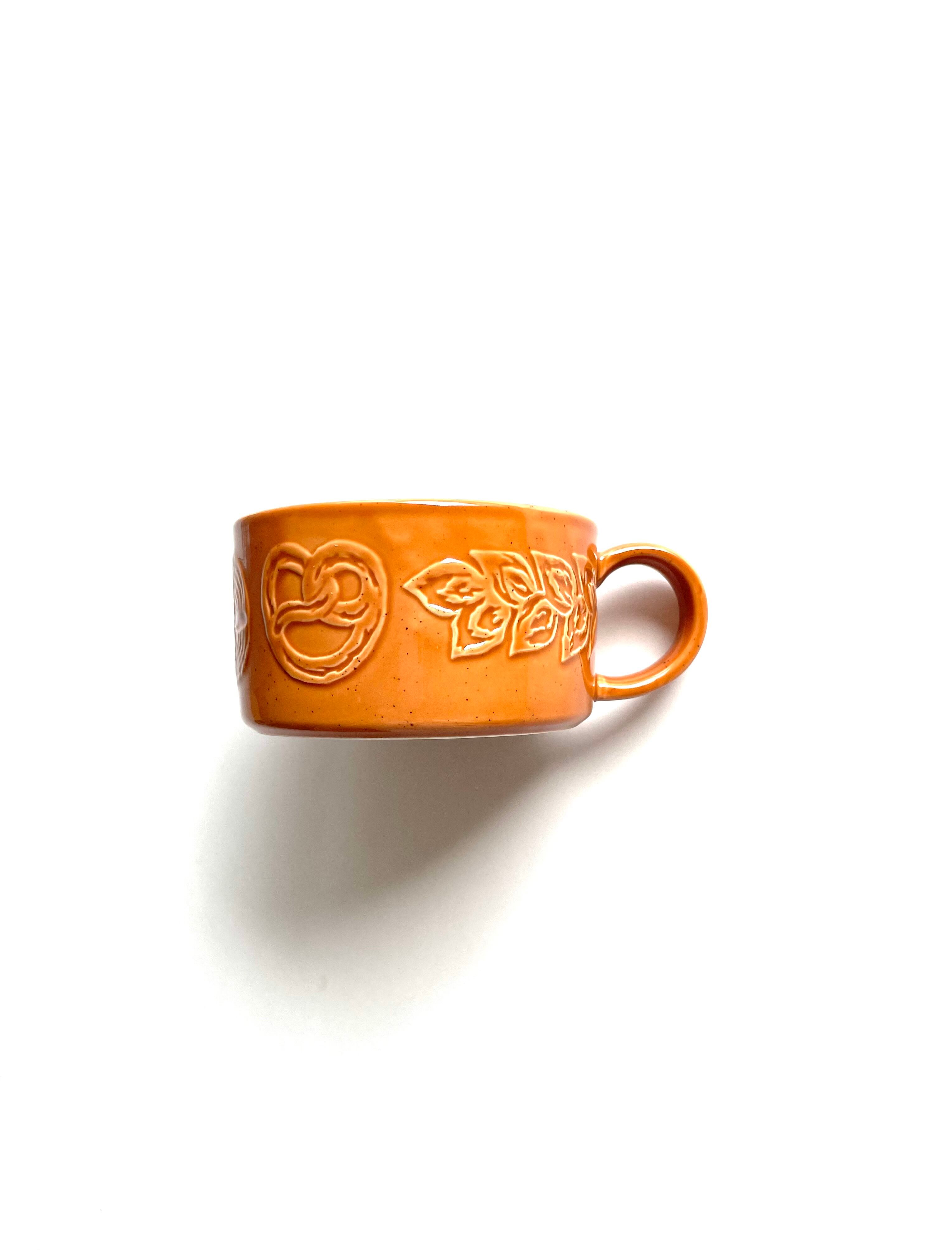 様々のパンのレリーフがぐるりと入った、きつね色スープマグ。木製スプーンつき。